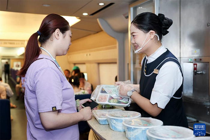 7月1日,長三角鐵路上的餐飲服務(wù)員為旅客介紹新品餐食。
