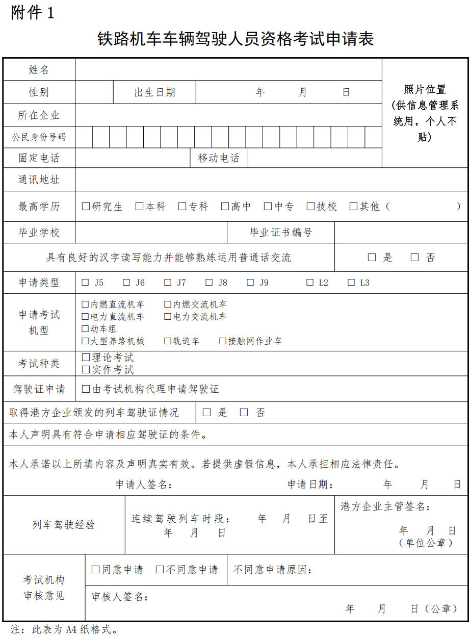 附件:1.鐵路機車車輛駕駛人員資格考試申請表