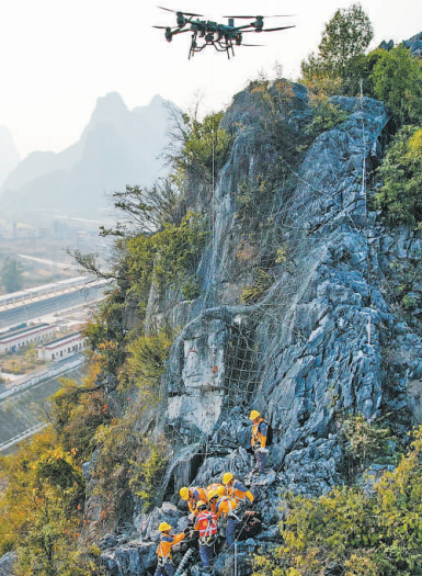 黔桂鐵路一處沿線山體上,中國鐵路南寧局集團(tuán)公司柳州工務(wù)段橋隧工用無人機(jī)運(yùn)輸?shù)牟牧险挝J?/div>