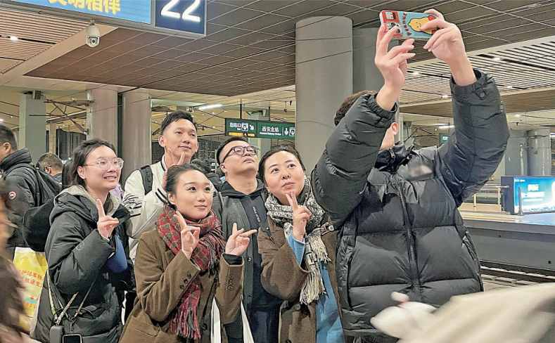 乘坐高鐵返程的旅客,在西安北站站臺上合影。